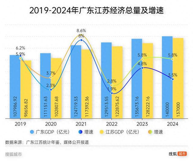 正在召开的江苏两会透露,2024年江苏GDP增速5.8%,总量达到13.7万亿元,跟广东只差半个身位,看看近几年的数据,江苏“越战越勇”。2020年-2023年,江苏全年经济增速分别高出广东1.4个、0.8个、0.8个、1个百分点,2024年至少高出2个百分点。