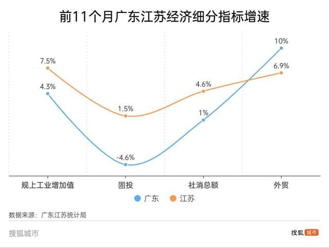 相比之下,2024年江苏经济三驾马车走得更稳。前11个月,江苏固投、社消零售总额分别增长1.5%、4.5%,两项指标超过广东6个、3.6个百分点。对比鲜明的是,广东汽车消费下降一成,江苏限上新能源汽车零售额增长四成多。