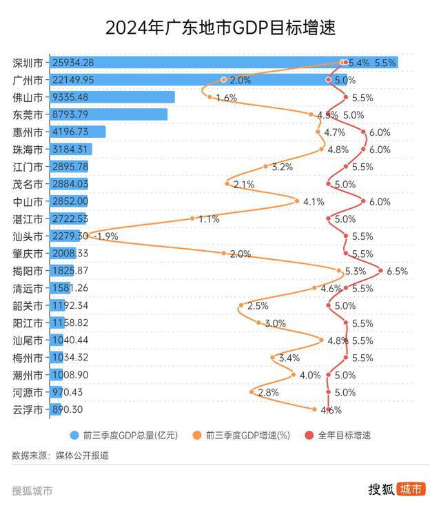 上述“国民经济报告”解释称,广东2024年GDP增速不及目标主要原因是有效需求不足、居民企业预期偏弱,特别是房地产下行和金融业调整的影响较大。从地市数据来看,前三季度,除深圳之外,广东21个地市经济增速均未达到全省预期5%的增速。